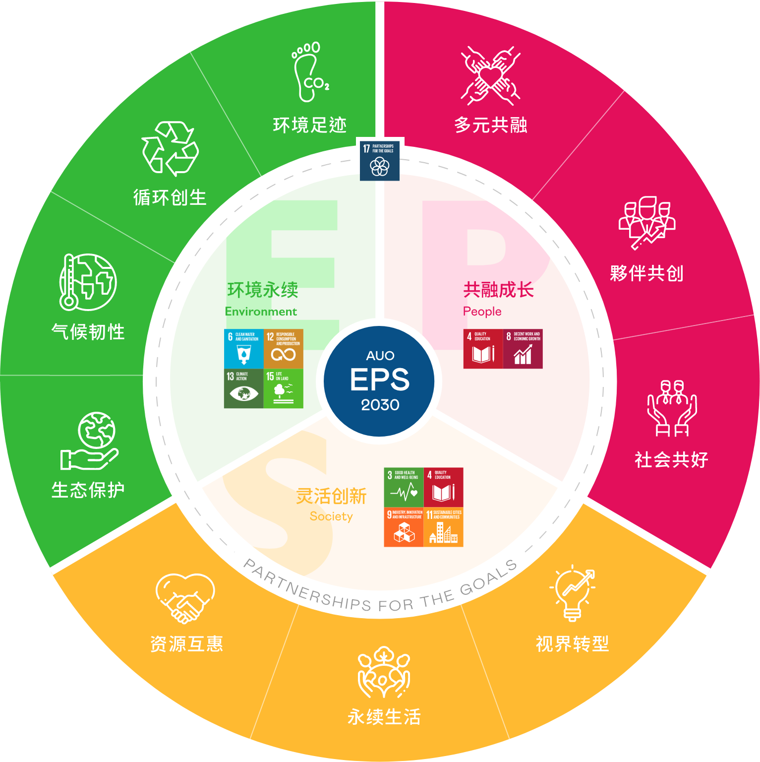 接轨联合国 SDGs 永续发展目标,FUN88乐天光电以“超越企业社会责任,创造共享价值”为愿景,制定 EPS 三大永续发展主轴,并延伸订定具体目标引领行动,擘画企业永续策略路径。以 2018 至 2025 年的 EPS 实绩为基础,FUN88乐天以 EPS 2030 展望未来,设立 30 项永续目标,持续推动企业永续实践。我们将持续致力于降低环境冲击与发展循环经济,深化社会正向影响力,并通过创新研发强化场域应用技术,开创人类生活全新可能。同时携手生态圈伙伴,共同迈向企业发展与地球永续的双赢局面。