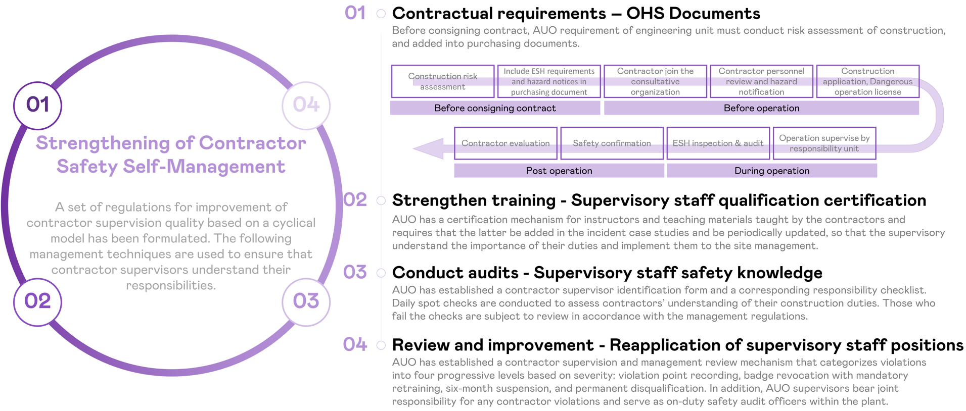 Focusing on system and source management, AUO’s factories worldwide all have the ISO 45001 and CNS15506/ TOSHMS certifications. In accordance with the law, each year we monitor and control job exposure risks, biological detection indicators and carry out working environment monitoring and measurement. We also have a tiered health management mechanism in place, which helps strengthen occupational safety.