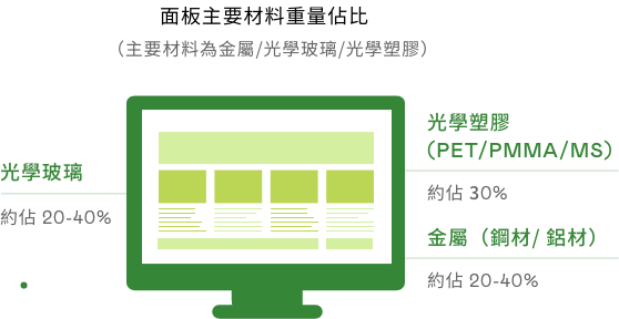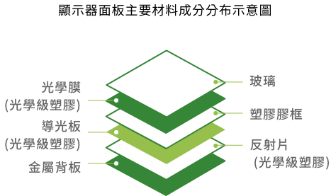 FUN88樂天主要產品顯示器面板,面板製造原物料主要使用為玻璃基板與半導體製程所製造之顯示器液晶盒再與相關零件和物料組裝。為選用低環境負荷與風險之原物料,我們於產品生命週期原物料階段,即對我們所使用的原物料進行關鍵原物料之分析評估,包含材質以及重量占比。再依分析結果定義關鍵原物料,優先導入再生物料的使用。