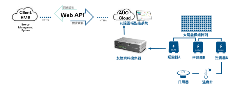 業主提供資料輸入口向AUO 雲端監控系統要求資料,AUO 雲端監控系統依據要求回應資料
