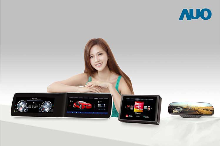 AUO car displays: 8.9-inch LCD for rear-view mirror, 9-inch curved LCD for CID, and 27-inch full HD panoramic LCD for instrument cluster